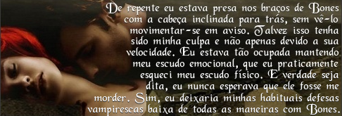 Senti-o tremer. Bones me apertou tão forte que seu corpo se entrelaçou ao meu, empurrando minha cabeça para trás junto com um punhado de cabelo, até nossos olhos se cruzarem. O que havia começado como um jogo era agora um desafio aberto, uma ameaça direta. (...)